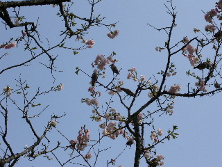 「梅にメジロ」は付き物だが、桜の場合は何だろう。ある1本の桜の枝に鳥が何匹も止まって、忙しく花弁をついばんでいた。目の周りが白いのがメジロだが、この鳥は違うようだ。誰かが「あれはヒヨドリだ」と言っていたが、そうなのだろうか。