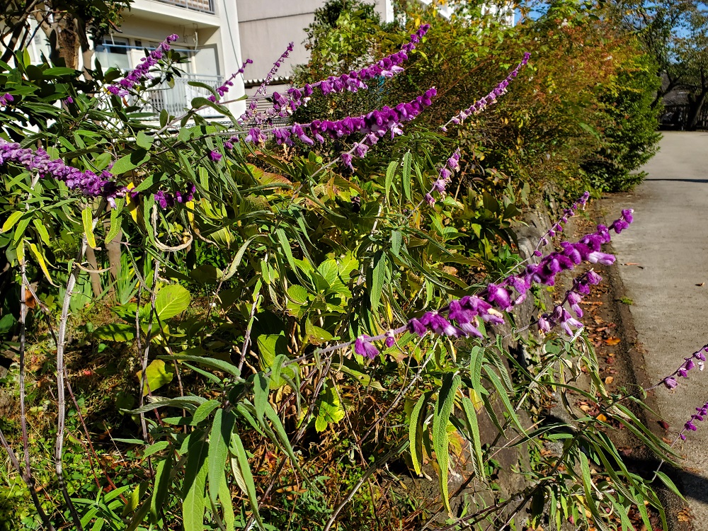 秋の庭を彩ってくれる短日性のサルビアがサルビア・レウカンサ。英名でメキシカンブッシュセージ、アメジストセージとも呼ばれる。