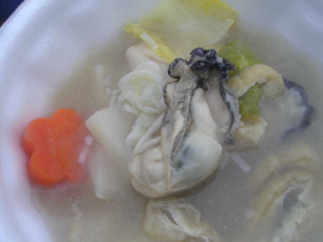 この日食べたのは「かき汁」、「かきフライ」、それに夕食用の「かきめし」。どれも熱々でとてもおいしかったのは確か。残念だったのは「日生新名物カキお好み焼き」を食べ逃したこと。会場内の出店には1時間待ちの行列ができていた。昨冬新登場した「カキフライソフトクリーム」には手が出なかったが・・・。
