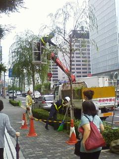 仕事を終えてビルの外に出た途端、通りの柳が気持ち良さそうに”散発”してもらっていた。確か昨年末にも同じ光景を見掛けたので、”散発”はどうも年2回らしい。