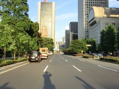 暑くてぎらぎら照りつける陽光もうれしくないが、やはり雨や曇天ばかりでは辛い。何事もバランスが肝心だ。午後6時すぎなのに、まだ明るい。交差点の真ん中でカメラを構える自分の姿が影になっていた。正面はみずほ銀行本店。