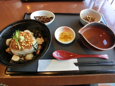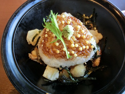 ここで見つけたのが近江三昧土山の朝食メニュー。その名もずばり「朝ひつまぶし」。お椀の中にうなぎのタレを付けたおにぎりが1個入っていた。周りに小さく刻んだうなぎと焼いたお餅が配置されている。