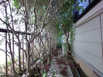 小さな家の周りを生け垣が取り巻いている。玄関前のフェンスの外と脇のフェンスの内は堂山つつじ、裏庭のフェンスの内はサザンカだ。玄関前のフェンスの外の堂山つつじは元地主さんが植えていた。そのつつじをもらって脇のフェンスの内側に植えた。サザンカは義兄の実家からもらった。