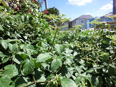 別名もある。「ビンボウカズラ」(貧乏葛)。繁茂すると、樹木が枯れて、家が貧乏になるからだ。巻きヒゲでフェンスや他の植物に絡みつく。ヒゲは宙を突いて揺れながら伸び、触れたものに巻き付く。それも、首を絞めるように、らせん状に何重にも巻き付く。ツゲや梅、あじさいなども締め付けられていた。