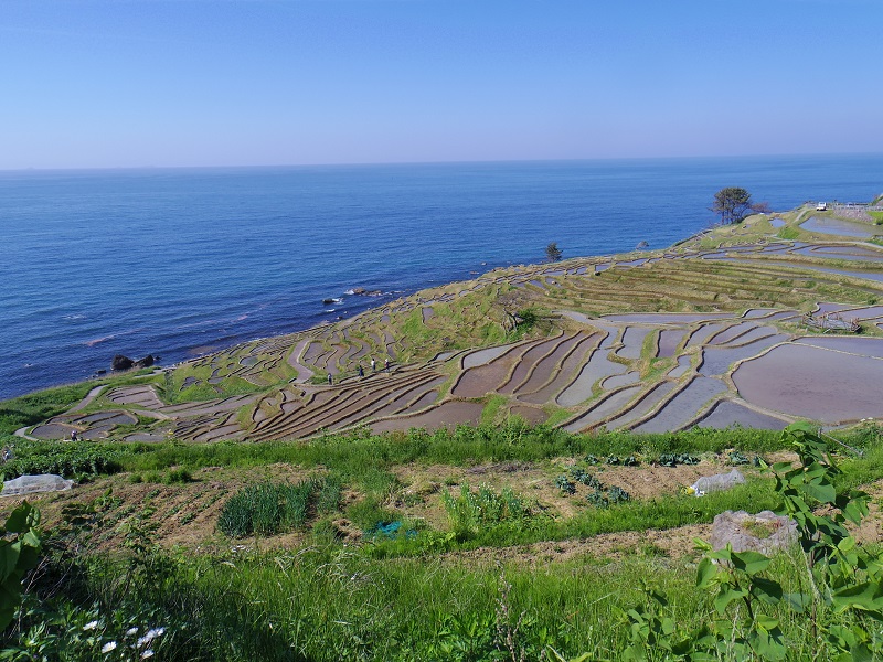 白米千枚田(しろよねせんまいだ)に行った。輪島市白米町にある棚田だ。日本海に面して、小さな田が重なり、海岸まで続く絶景。奥能登を代表する観光スポットだ。GWはごった返したはずだ。この日はそれほどでもなかった。