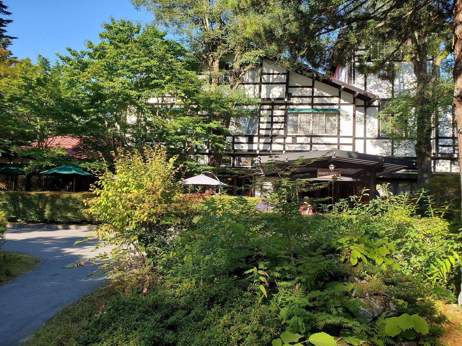 万平ホテルのカフェテラスはジョン・レノンファミリーも利用していたことで有名だ。夏には爽やかな風が吹き抜け軽井沢らしさを感じる。ウッドデッキは愛犬と一緒に利用することが可能だ。