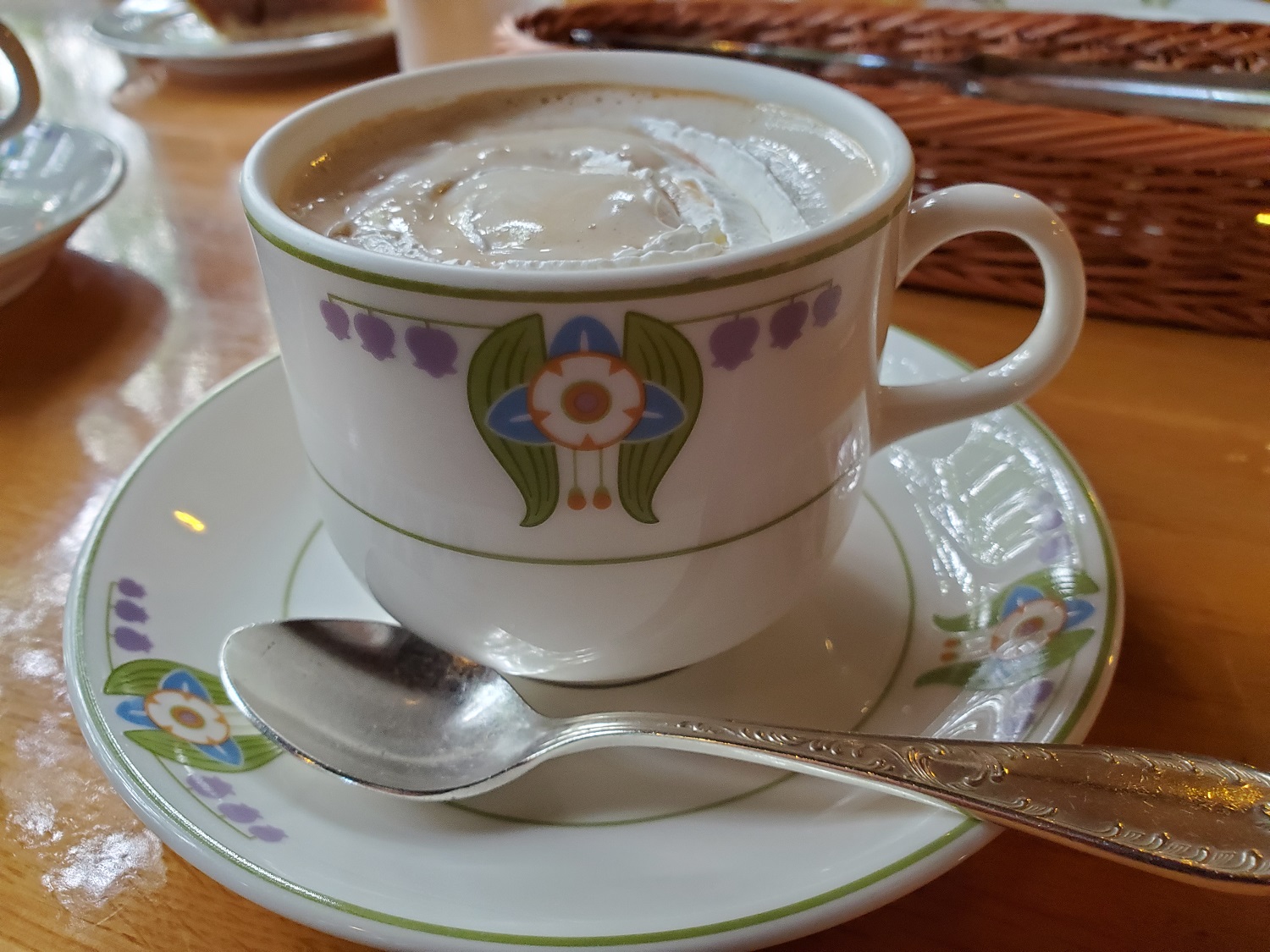 万平ホテルが厳選した紅茶とまろやかなミルクのハーモニー「ロイヤルミルクティー」を楽しんだ。ジョン・レノン直伝の逸品だそうな。もちろんお値段も逸品の1100円也。