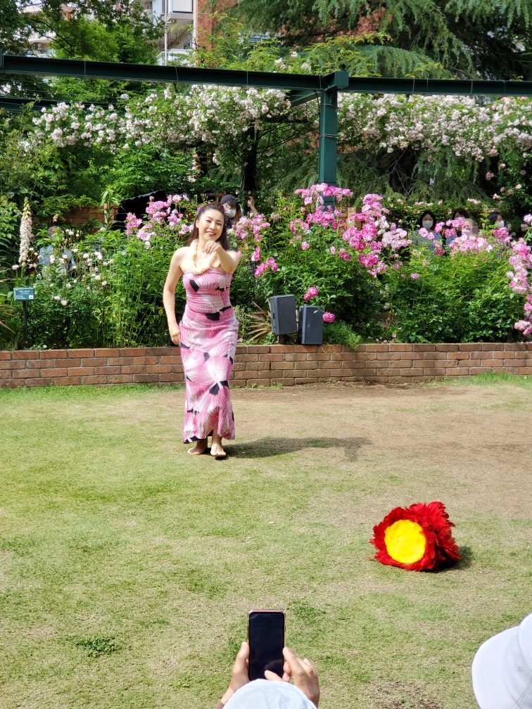 それも真っ盛りのバラに囲まれながら、クネクネとゆったりと全身を動かし踊りの花を咲かせるフラダンス。なかなか見られるものではない。しかも踊り手は芝生の上とはいえ裸足である。優雅に踊っているものの、暑かったのではないか。