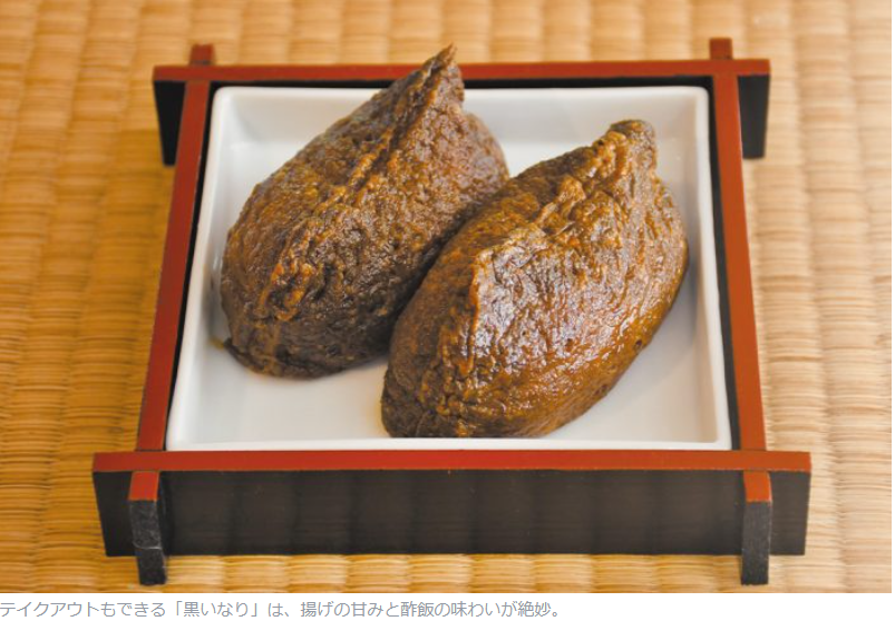 看板メニューの「黒いなり」(1個220円)は地元のおばあちゃんから受け継いだ数十年物の味噌が命だという。