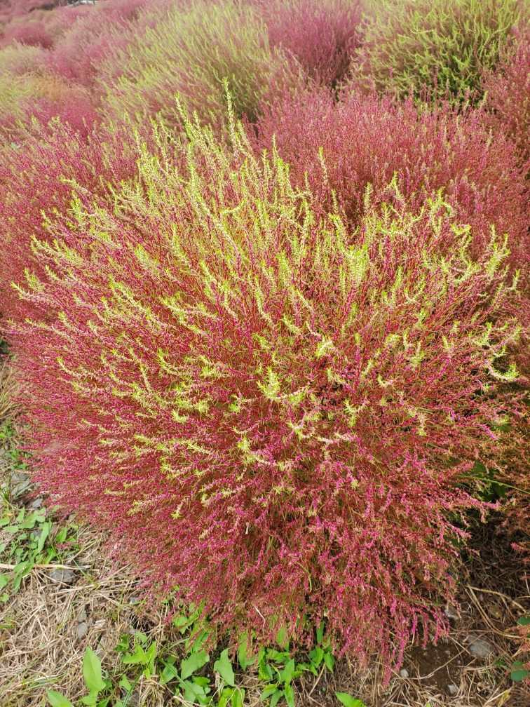 10月19日(日)は曇り空ながら紅葉を迎えたコキアが真っ赤に燃えちょうど見頃だった。コキアは別名ほうき草と言われる一年草。6月頃の緑葉から秋の深まりにかけて赤色に変貌し、最後は黄金色に変わる。